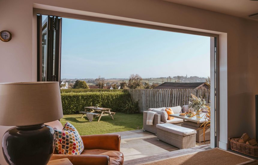 Glass sliding doors connect the inside with the outside and you can pad barefoot from the lounge onto the toasty sun deck. Here wrap hands round a steaming cup of tea and take in the views across the lush green fields. Four-legged friends and little ones can play safely on the secure lawn. As night falls watch the stars appear in the clear night's sky.