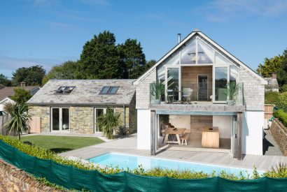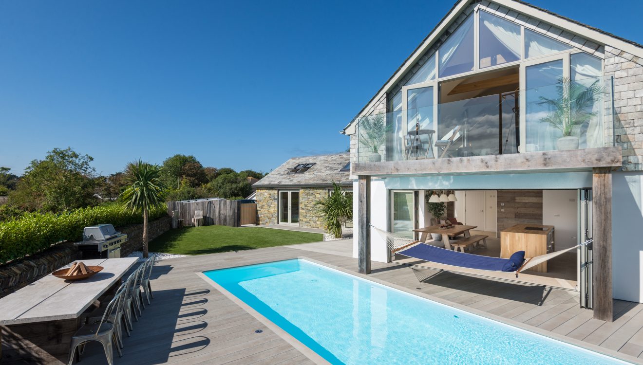 With glass sliding doors spanning the width of the kitchen and dining area, you can enjoy inside outside living at its best. A large decking area extends across the garden. Here, a hammock sways between two rustic wooden pillars, perfectly positioned alongside the heated swimming pool; a peaceful place for floating without a care in the world under the Cornish sunshine.
