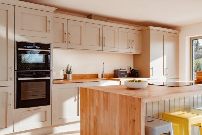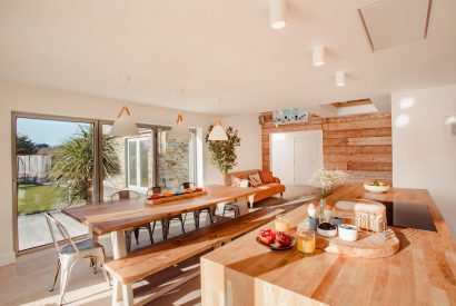 Inside, crisp white walls combine with sandy hues to create a relaxing, warm ambience. The vast open plan kitchen and dining area provides a stylish setting for holiday meals and entertaining. Enjoy your morning coffee at the large breakfast bar. In the evening, dine together around the statement wooden table, taking in the views across the manicured garden.