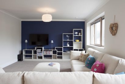 The large lounge is softly carpeted, with plush cream sofas to sink into after a day at the beach. A contemporary log burner provides a cosy atmosphere for evenings in with the family. Steps lead down to the dining area, with full-length glass doors leading to the balcony.