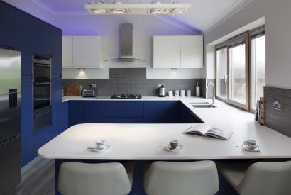 - High-specification kitchen with breakfast bar, fridge freezer, Neff double oven with warming drawer, Neff gas hob with wok burner, microwave, dishwasher, toaster and kettle.