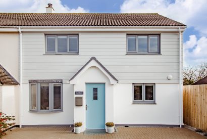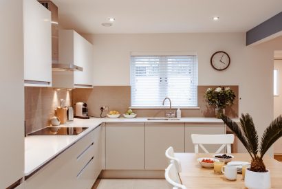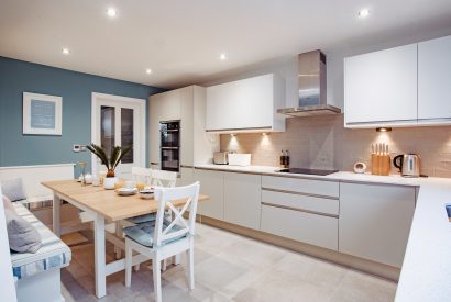 Holibobs is a stylish build where crisp white walls meet coastal grey cladding. Enter through the pretty blue front door into a contemporary kitchen and dining room. Here, chic white worktops and textured grey tiles create the most stylish of setting for a spot of holiday cooking. A dining table sits opposite and built-in seating provides plenty of room for holiday meals with the whole family.