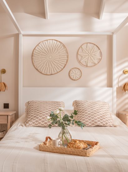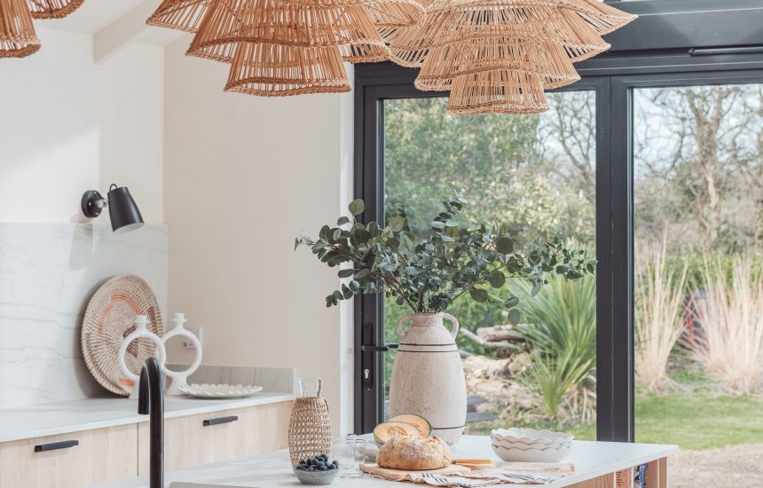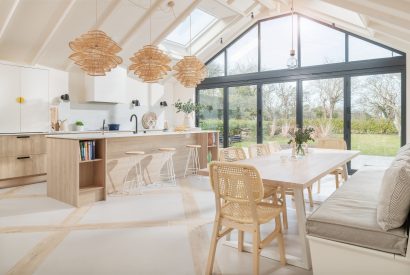 In the bedrooms, coastal influences subtly thread through the design with rattan wardrobe panels adding sumptuous texture. Set against a backdrop of limed oak shutters and warm timber flooring, they soften the angles of the space. Every detail has been considered to ensure an effortless flow, a harmony between light and structure where tranquillity reigns.