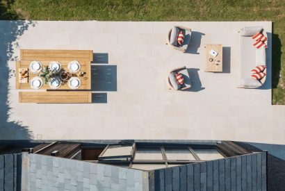 Inside, the atmosphere is one of ease and luxury. The palette remains neutral, calming and grounded, while layers of natural materials bring depth and warmth. Wood, rattan and stone are thoughtfully combined, each surface tactile and inviting. The spacious kitchen exemplifies this philosophy; pared back, timeless and beautifully simple, where materials do the talking.