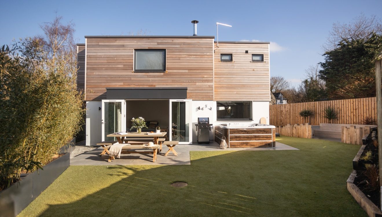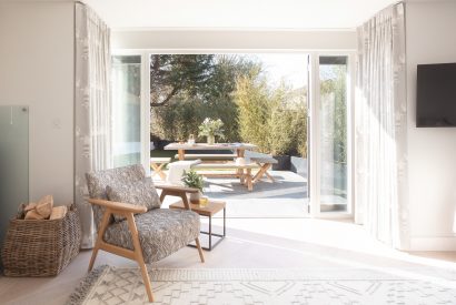 Open up the doors from the living space to the sunny patio. A stylish dining table provides the setting for holiday feasts and barbecues. Here, a bubbling hot tub provides the perfect refuge after a day hiking the nearby coastal paths. A vibrant lawn is bordered by sleek grey planters spilling with bamboo. Behind a steam, gently trickles by. As night falls, head to the built-in seating area bordered by swaying sea grasses. Swathe yourself in blankets and enjoy mugs of steaming hot chocolate as smoke from the chimenea spirals into the clear night's sky.