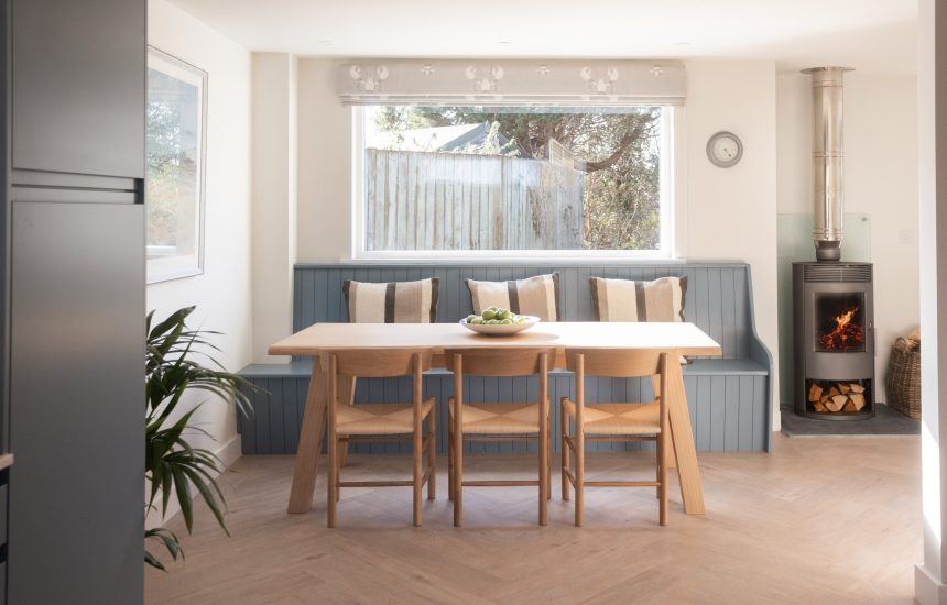 Beautiful in blue, the stylish kitchen has everything you need to make yourself at home. A statement dining table with built-in window seat sit alongside. This provides the setting for lazy holiday breakfast with a view across the garden. Light streams through the double doors into the dreamy living space. A soft blue, velvet corner sofa provides the ultimate spot for rest and relaxation. In winter months, warm toes beside the crackling log burner and share tales of the year gone by. A TV snug hides on the ground floor, where holiday board games and movie marathons can unfold.