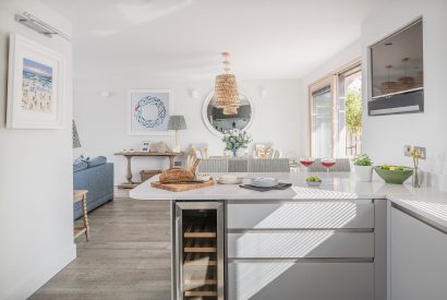 Inside, Longships is a haven of contemporary comfort. The stylish yet relaxed open-plan living space centres around a striking feature fireplace, perfectly placed beneath a wall-mounted TV - ideal for cosy evenings in. The dining area, with its statement pendant lighting and chunky wooden table, sets the scene for long, laughter-filled family meals, while the adjoining modern kitchen is fully equipped for effortless holiday feasts.
