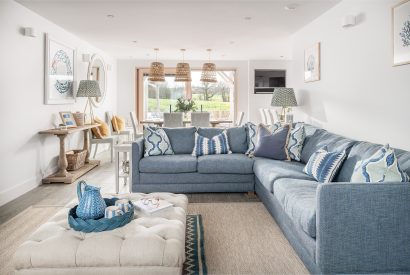 For quieter moments, a separate snug offers a cosy retreat, perfect for film nights and games. Here, a plush corner sofa doubles as a bed, providing extra space for guests.