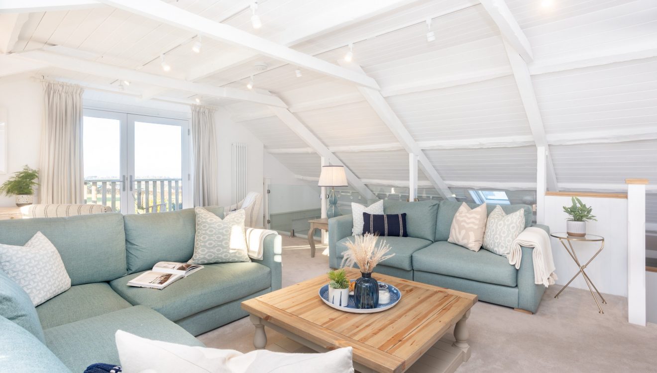 Wooden steps lead from the kitchen to the peaceful haven of the living room. Sink into the mossy green sofas that sit under white beams and sloped ceilings. Throw open the double doors to the balcony and let the soft sea breeze blow in. Spend winter nights unfurled on the sinkable sofas or curled beside the log burner, sharing tales of the year gone by.