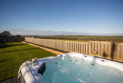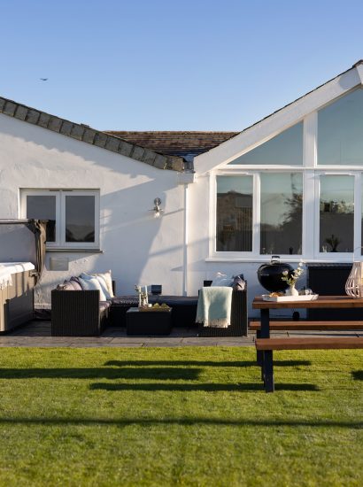 Outside, a statement table sits on a generous patio, a stylish backdrop for al fresco dining. The patio melts into the soft green grass bordered by white hydrangeas, providing a sheltered spot for soaking up the Cornish sunshine. A wildflower patch comes alive with colourful blooms in the spring and summer months and a bubbling hot tub sits alongside, perfectly positioned to watch the sun melt into the ocean beyond.