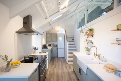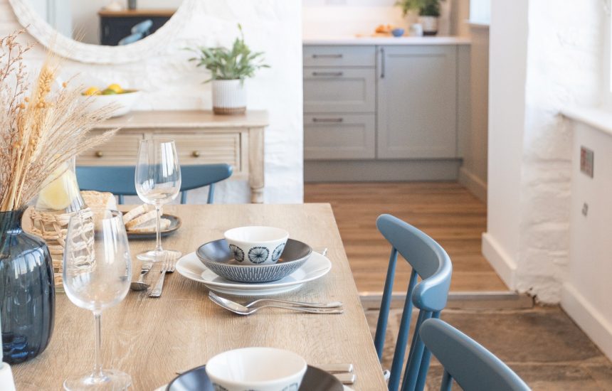 Whip up a storm in the beautifully styled kitchen where a deep Belfast sink sits below wooden shelves spilling with treasures. Pick up local treats from the delis and farm shops and prepare holiday feasts on the Rangemaster, taking centre stage in the kitchen. A chunky wooden dining table sits upon a labyrinth of slate flagstones providing the setting for a family meal overlooking the garden.