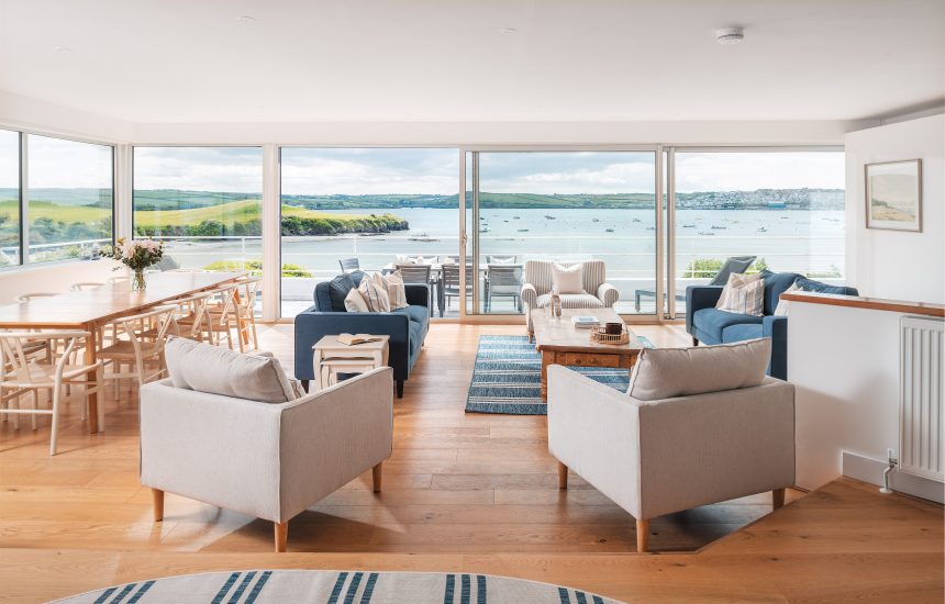 There is parking directly outside Mullets. Pass through wooden gates to the front door which takes you into the upper level of the property involving two steps. The back door entry from the drive into the playroom is more accessible. The first floor has a large open-plan living area with kitchen, dining area and lounge. There are a couple of steps between the kitchen area and the lounge. You’ll find two bedrooms on the first floor: one with an en-suite bathroom and one with a wet room adjacent. From the lounge you can access the large balcony with views over Porthilly Cove and the Camel Estuary.