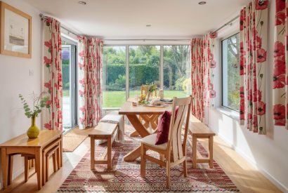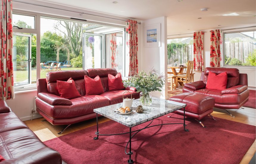 Flowing seamlessly from the kitchen is the open-plan dining and living space; spacious and light-filled, with large windows and bi-fold doors inviting the outdoors in. With pops of vibrant poppy-red woven into the décor, the large sofas offer the perfect spot to curl up with a good book and enjoy a film with family.