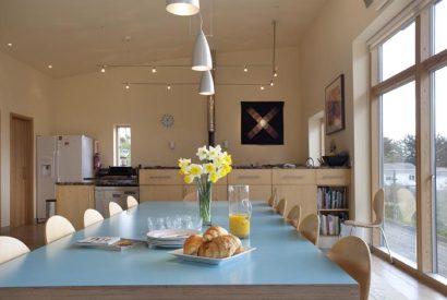 The light and airy social spaces have high ceilings and wooden floors, and open up to a long glass and steel balcony. This houses a large wooden decking area between the kitchen/dining room and the lounge, making it a wonderful spot for evening drinks while the sun goes down. The spacious lounge has a feature wood burner, vast sofas, beanbags and even a library. There is also a separate sitting room, perfect for children to play in while adults enjoy some peace and quiet.