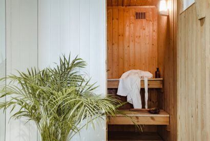 The traditional farmhouse kitchen is spacious, with a stylish combination of slate floors and crisp white decor. A large wooden table with feature lighting hanging above provides the perfect space for a family meal. Double full-length glass doors open out to the sun terrace, which is ideal for entertaining. The kitchen leads to a plush living room with a beautiful feature fireplace, white wooden beams and inviting soft furnishings. Also downstairs is a shower room with sauna for unwinding after a busy day exploring.