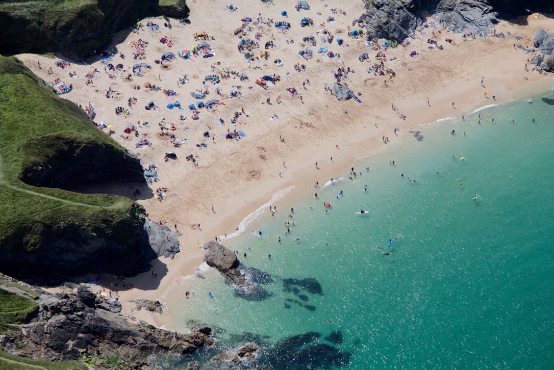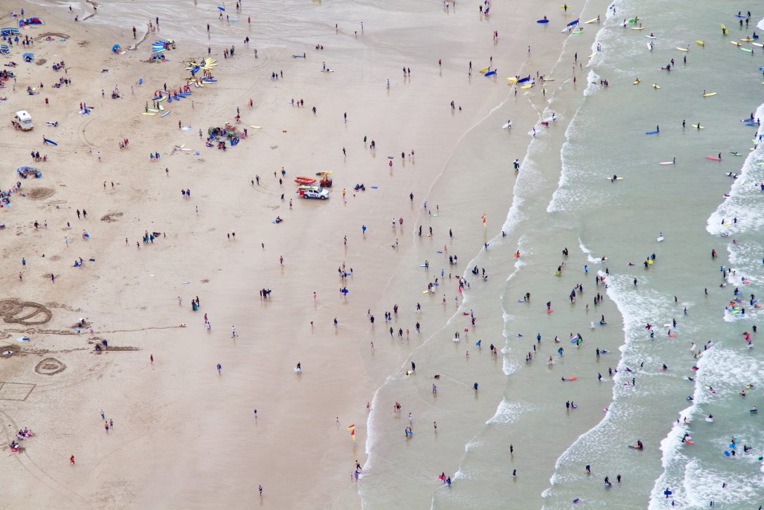 The aerial concept started a few years ago after spending so much time in the sea and then wondering what this scene looked like from above. I booked a trip in a helicopter and flew over Rock and Polzeath with the doors off. I leant out of the helicopter to record the views.