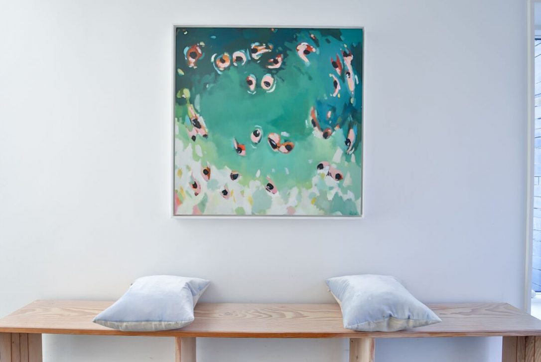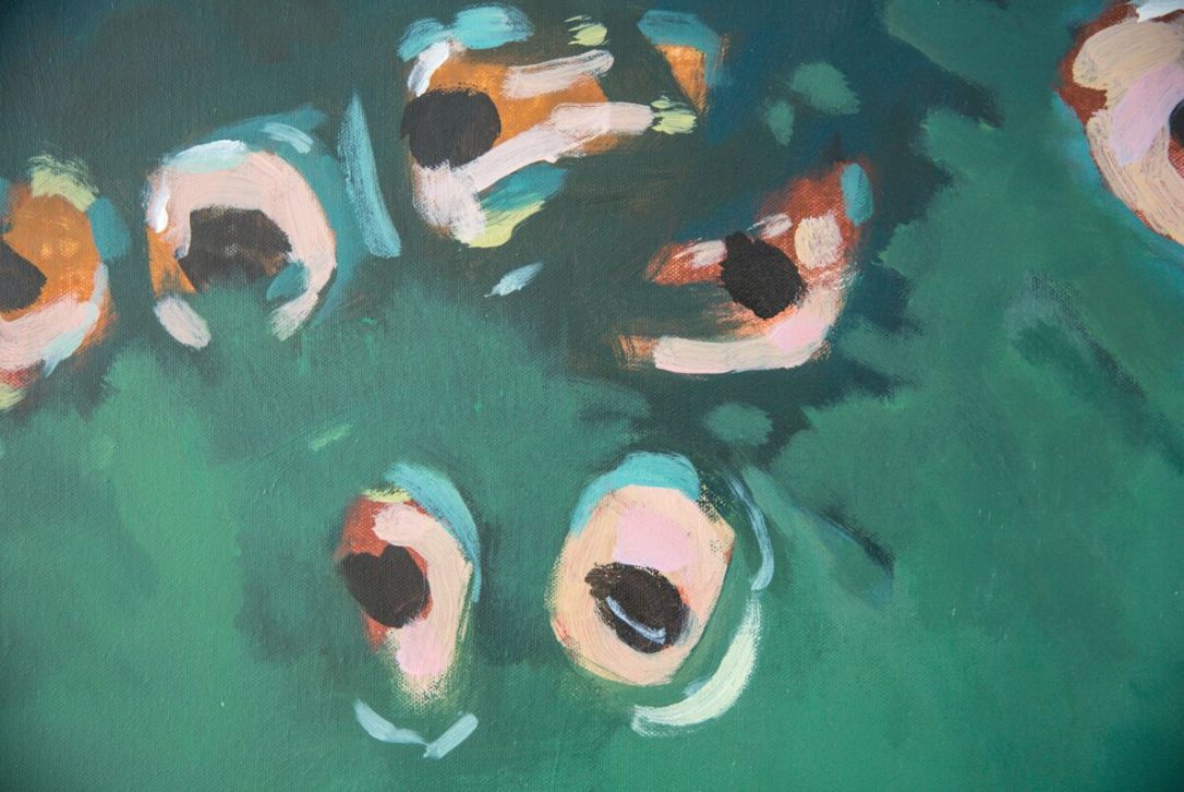 I paint these seascape scenes from a bird's eye view. Capturing the colours of the water, the surf, the people enjoying it all and the conversations between one another in the water. These salt waters supply a discrete dose of human therapy which is often overseen. With my work I want to show the viewer how much we as humans love the ocean and create awareness of its greatness, this is why I paint from a bird's eye perspective.