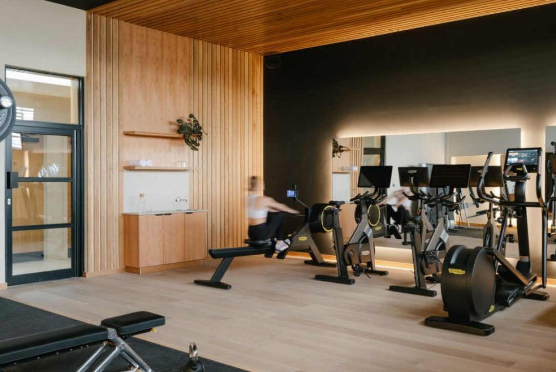 1. The new wellness space includes a studio, changing rooms with showers, gym (equipped with One Peloton bikes, the latest Techno Gym machines and free weights) and a health café. The space is purely powered by the sun, with solar panels above.