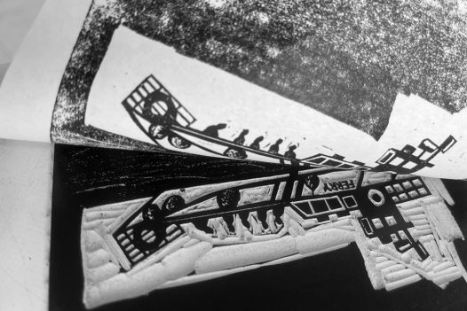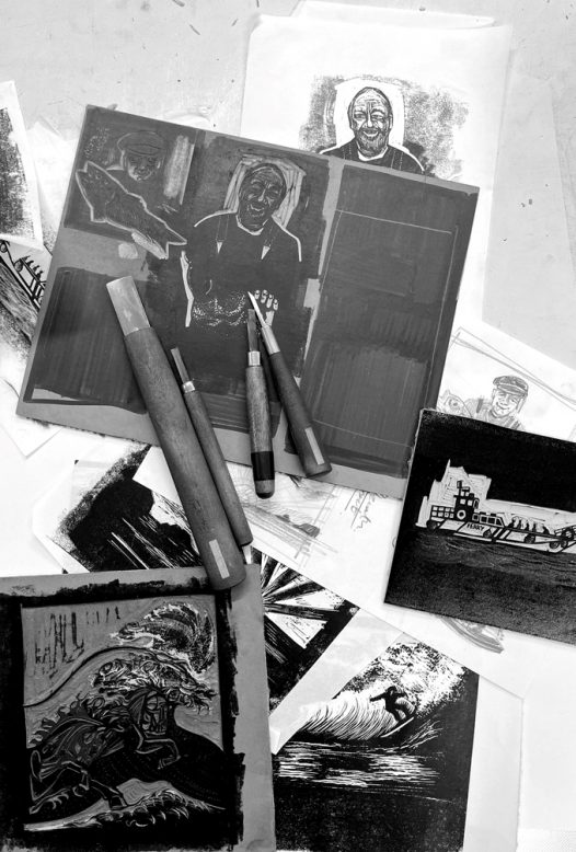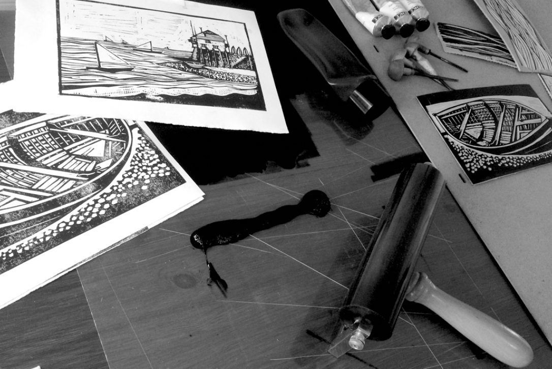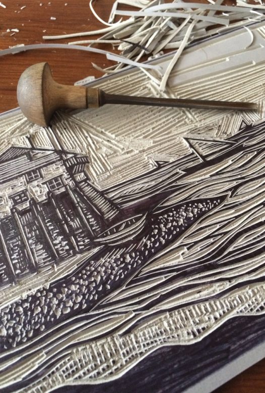 The illustrations are linocuts (something you may have tried at school). It involves carving into a piece of lino (think plastic flooring but a bit softer) and then rolling ink onto it.