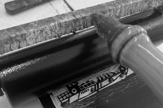 A piece of paper is placed on top of the inky surface and pressure is applied to transfer the ink. Pull the paper off and hey presto, you have a print. It's basically a stamp. A range of carving tools are used to cut the lino (Edward has a special Japanese carving knife called a Hangito).