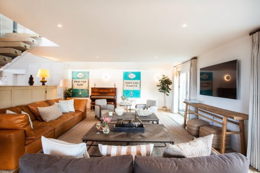 This delightfully unexpected discovery lies at the end of a tranquil lane where sweet apple blossoms, a bubbling hot tub and sumptuous interiors will soon wash away the remnants of everyday living. Inside, discover five dreamy bedrooms sleeping 10 to 11 guests. Outside, an annexe located above the garage offers extra capacity for up to three people. The weekly rate for Kernow House annexe is £450 during peak weeks and £350 during low season weeks. Kernow House welcomes dogs too so your four-legged friend can join in on the fun.