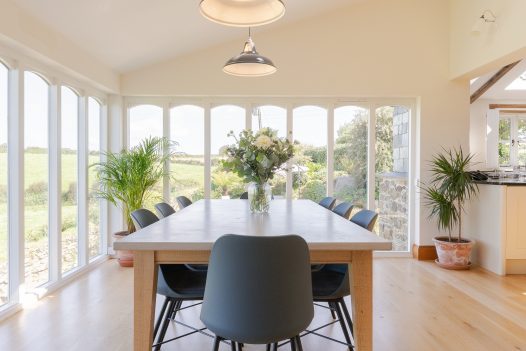 Inside, guests will be spoilt for choice with three characterful living spaces, boasting exposed brickwork and rustic oak beams. Dine in style as you gaze through arched windows and watch rolling fields melt into the ocean.