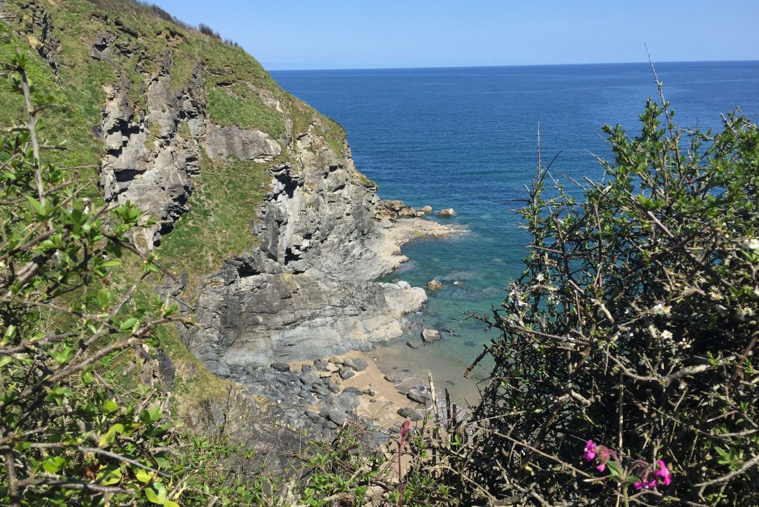 The path splits. Here you will find a viewing point down to the stunning sandy cove of Markhams Quay.
