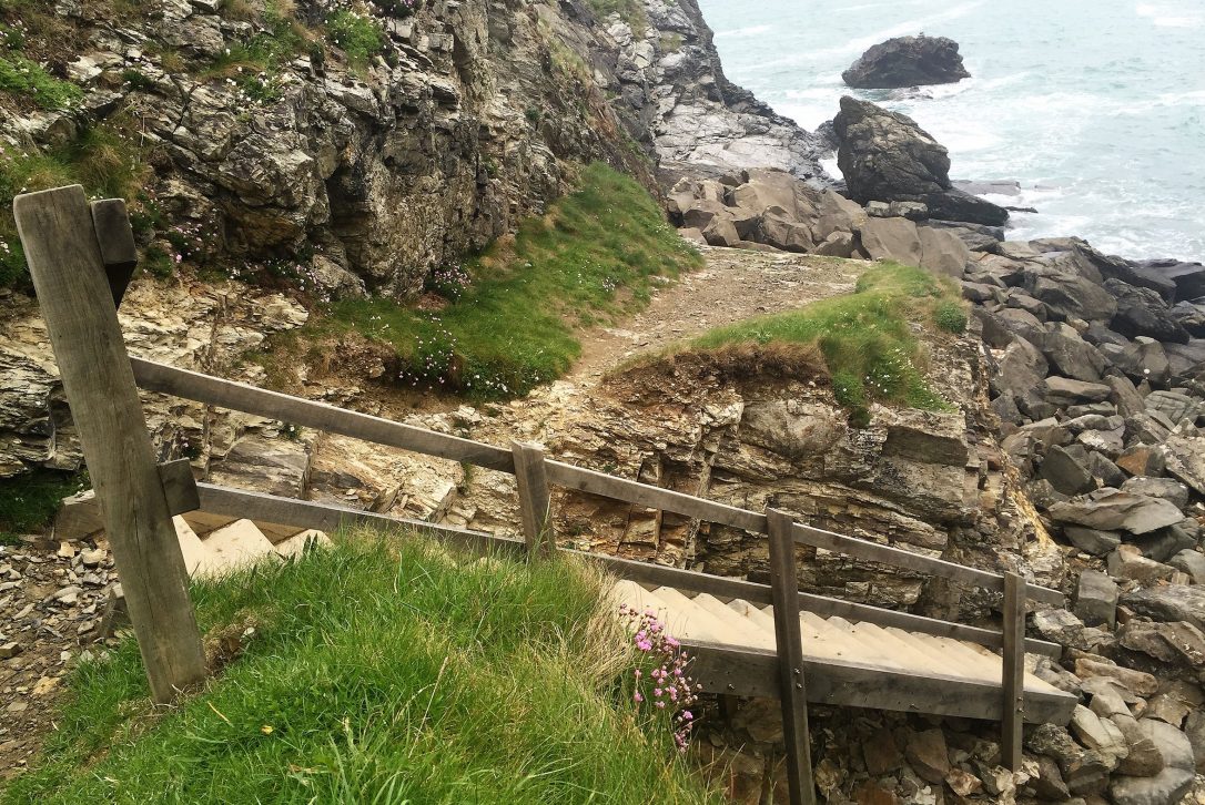 Highlights: Two viewing spots on the way down, one of a small and secluded sandy cove far below the path and the other of a collapsed sea cave. The small golden sandy beach of Lundy Bay on a lower tide at the bottom of the path.