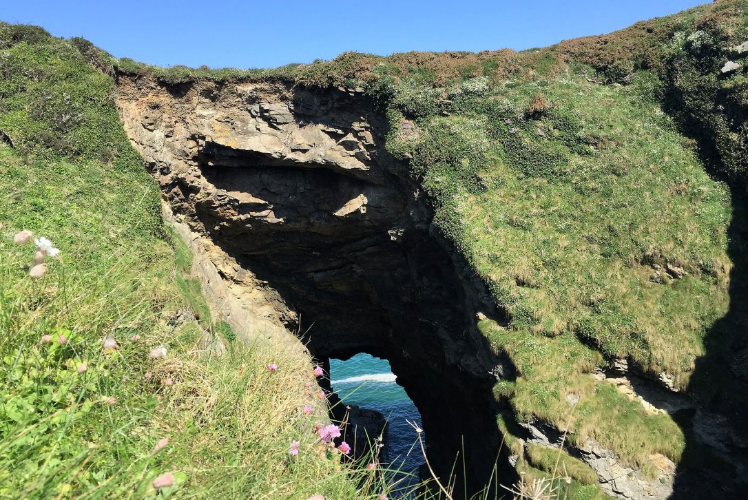 A little way up this path you'll come across a stone wall with a view down to a breathtaking collapsed sea cave.