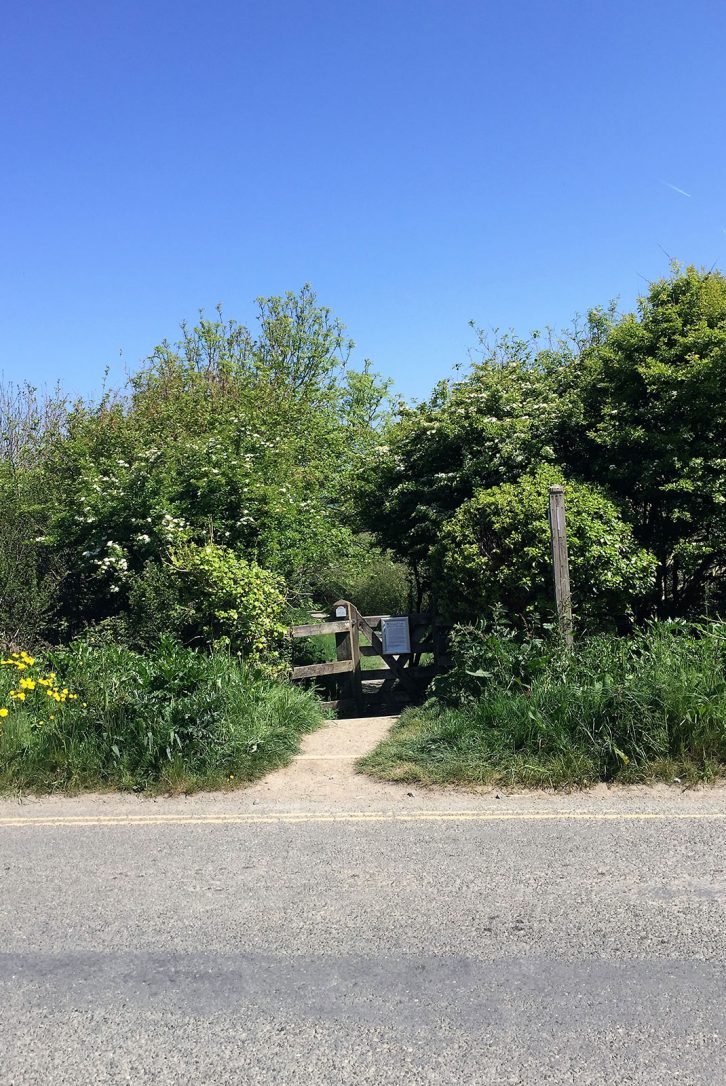 Cross the road from the car park (with care) and go through the wooden gate opposite. This opens out to a gently sloping footpath with trees to one side and a grassy meadow to the other.